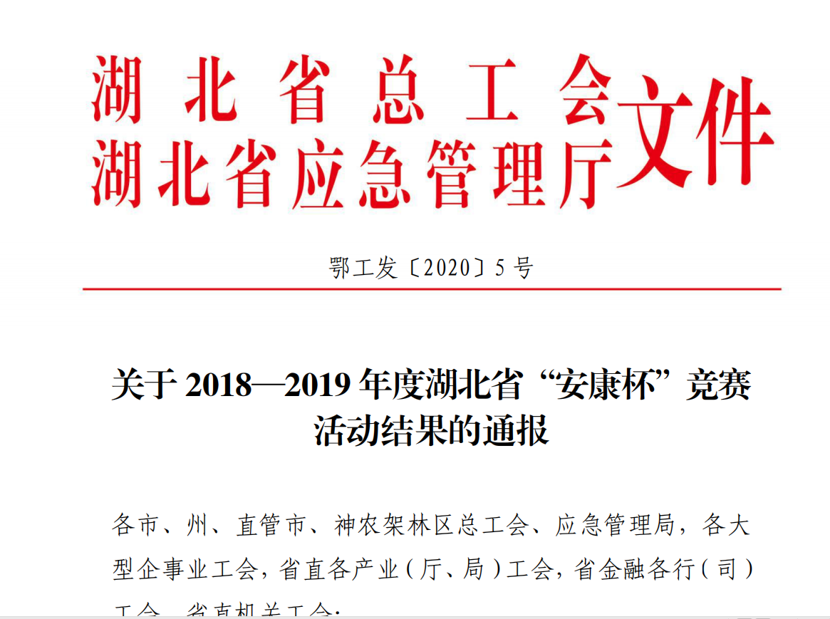 湖北省“安康杯”競賽由湖北省總工會、湖北省應急管理廳聯合主辦。“安康杯”競賽考核標準依據各行業的安全生產管理特點、傷亡事故和職業病控制水平等綜合因素制定,通過競賽考核參賽企業的安全生產管理、領導者安全生產意識、職工安全生產知識水平和能力、安全生產等各項指標。2018—2019年度共評出58個優勝單位、30個優秀組織單位、40名優秀個人。