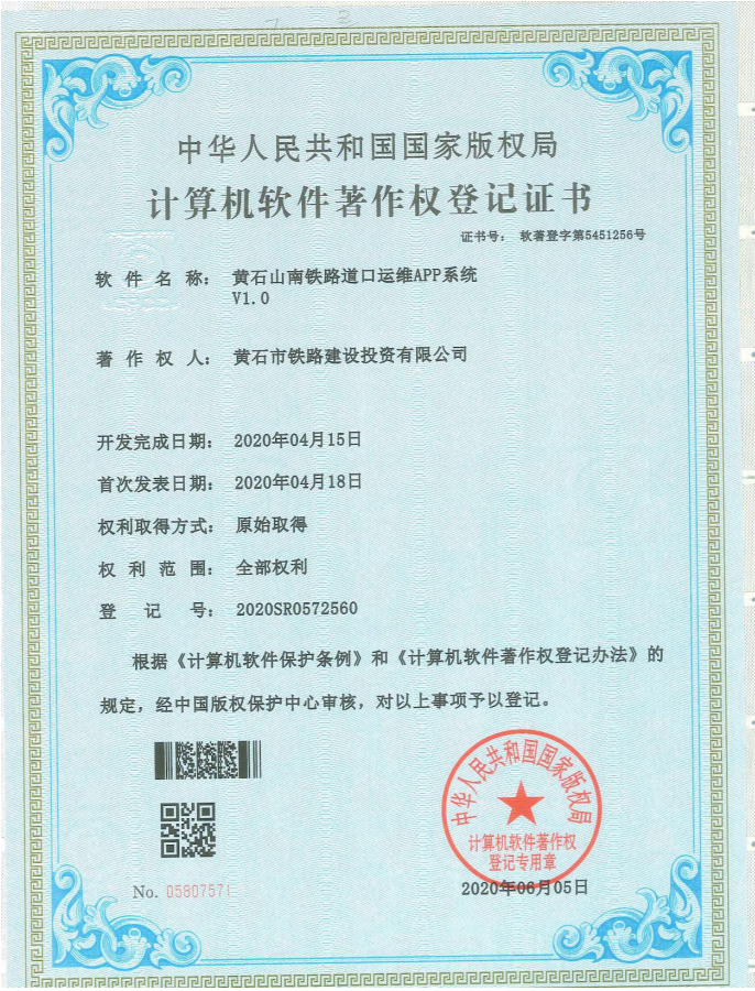 黃石山南鐵路道口無人值守技術共申請國家級8項專利技術 ,其中《黃石山南鐵路道口智能化控制系統》、《黃石山南鐵路道口列車車載聯動顯示系統》、《黃石山南鐵路道口調度中心綜合監管系統》、《黃石山南鐵路道口運維APP系統》4項成果已取得計算機軟件著作版權登記。