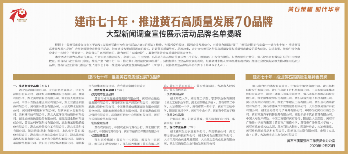 據悉,為振興疫后經濟,增強企業發展信心,市質量強市工作委員會辦公室組織開展了“黃石榮耀 時代華章——建市七十年·推進黃石高質量發展70品牌”大型新聞調查宣傳展示活動。該活動以黃石建市70年為契機,全面梳理和推介黃石品牌,最終推選出70個有廣泛社會知名度與影響力、在行業內處于領先地位、取得顯著經濟效益和社會效益的企業或其產品品牌。本次公布的“建市七十年·推進黃石高質量發展70品牌”,是從前期公布的近600家候選企業(品牌)中經過專家評審、網民投票,并結合各行業主管部門意見而推選產生的。